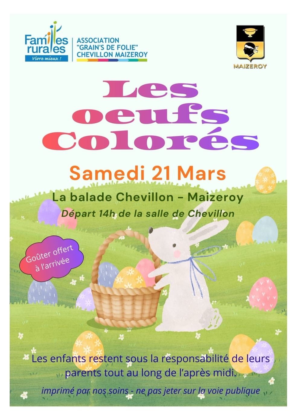 L'association Familles rurales - "Grain's de folie" invite les enfants accompagnés de leurs parents à rejoindre la balade Chevillon - Maizeroy, à la recherche des oeufs colorés, qui se déroulera le samdei 21 mars prochain.